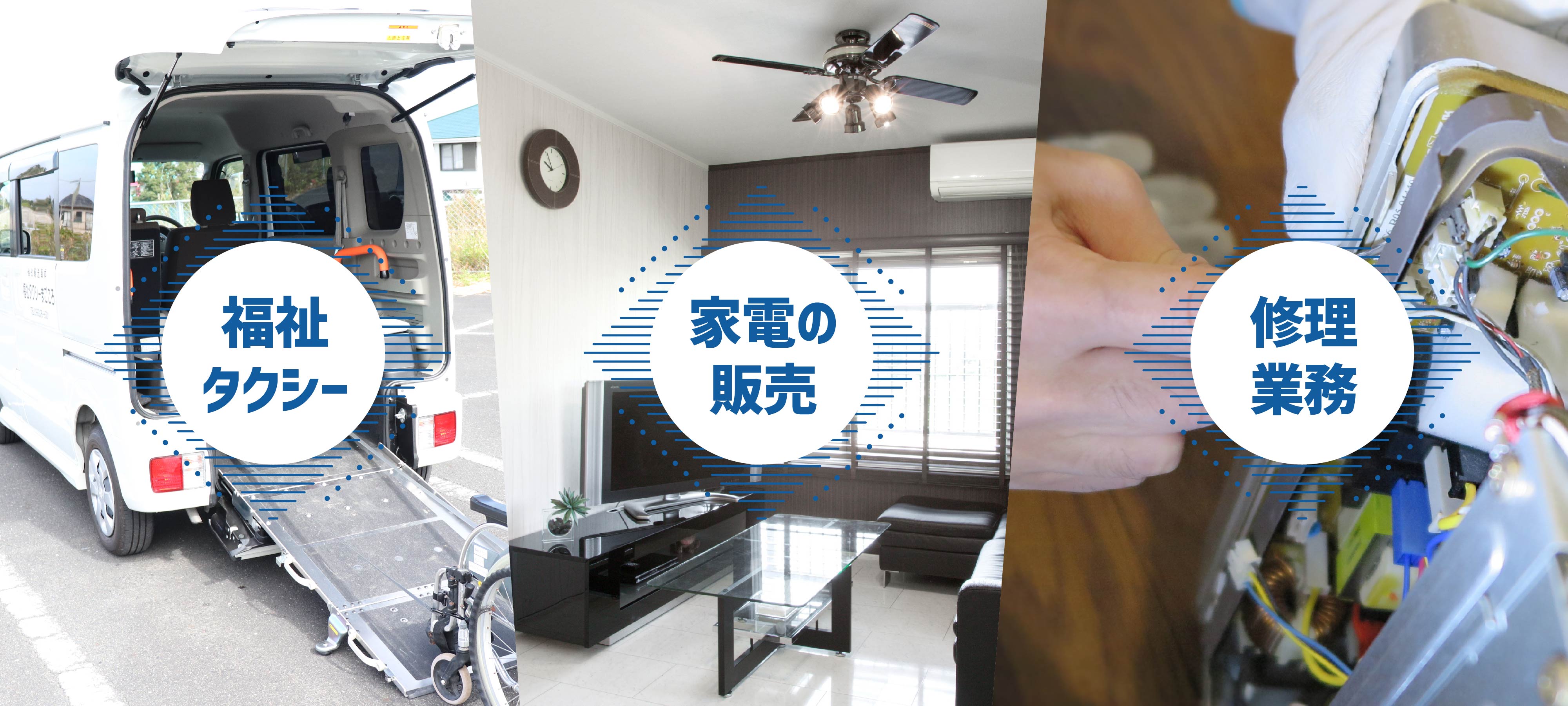 当社は、鹿児島県指宿市にて家電の販売・出張修理業務、福祉タクシー業務の運営業務を